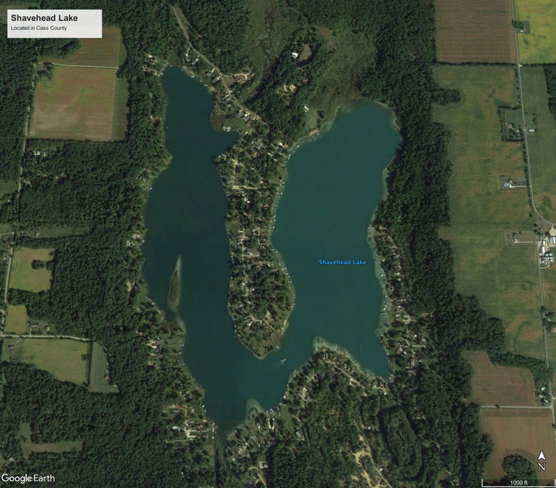 Shavehead Lake, located in Porter Township, Cass County, Michigan, is a 289-acre natural, spring-fed lake with a maximum depth of 70 feet. The lake features a horseshoe-shaped shoreline, offering clear waters and a sandy bottom, making it ideal for various recreational activities. Anglers can expect to find species such as bluegill, crappie, largemouth bass, and rainbow trout. The lake's clarity and relatively undeveloped surroundings provide a serene environment for pontooning, fishing, swimming, and snorkeling. Several lakefront Airbnb and VRBO rentals are available, many equipped with private docks, offering visitors a secluded and comfortable stay.